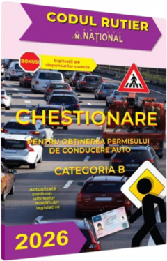 Actualizata în conformitate cu modificarile legislative recente, lucrarea Chestionare pentru obținerea permisului de conducere auto categoria B, ediția 2026, este conceputa pentru a facilita asimilarea și consolidarea noțiunilor teoretice fundamentale de circulație rutiera, necesare promovarii examenului pentru categoria B.